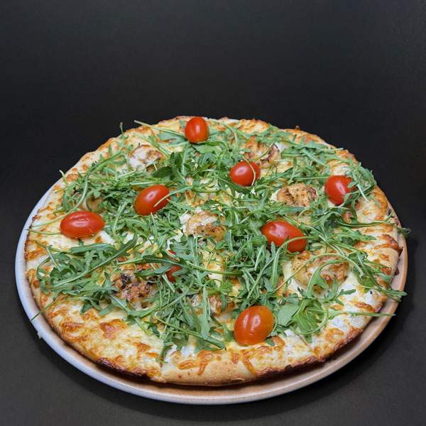 Összetevők: Sajt, Rukkola, Koktélparadicsom, Fokhagymás garnéla, Tejszínes