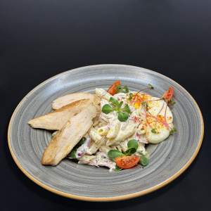 csirkemell, jégsaláta, paradicsom, lilahagyma, cézár-öntettel, zsemlekocka, trappista sajt